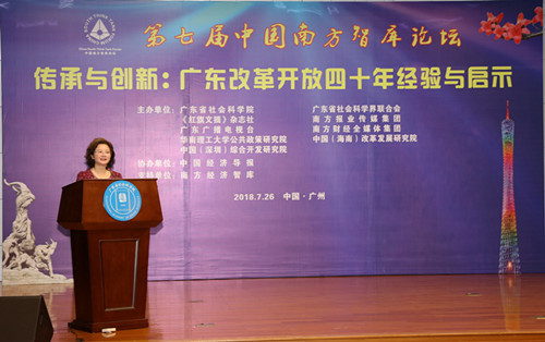 7月26日,由广东省社会科学院、广东省社会科学界联合会、《红旗文摘》杂志社、 南方报业传媒集团、 广东广播电视台、 南方财经全媒体集团、华南理工大学公共政策研究院、中国(海南)改革发展研究院和中国(深圳)综合开发研究院联合举办的第七届中国南方智库论坛在广州。论坛主题为“传承与创新:广东改革开放四十周年的经验与启示”。省社科联党组书记、主席王晓致辞,省委宣传部副部长蒋斌作了讲话,新加坡国立大学东亚研究所所长郑永年,中国(海南)改革发展研究院院长迟福林等著名学者发表了主题演讲,来自全国各地的专家学者共250余人参加了本届论坛。