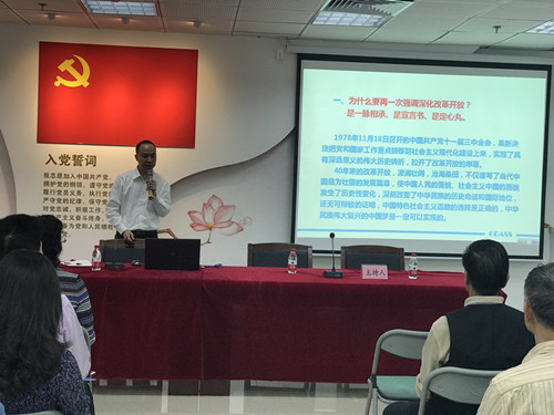 参观之后,办公室党支部书记李翰敏为大家上了一堂时效性强、理论水平高的党课。李翰敏同志以学习习近平总书记视察广东讲话精神为主题,从四个方面谈了他对改革开放大潮中如何发挥党员先锋模范作用的深刻体会。