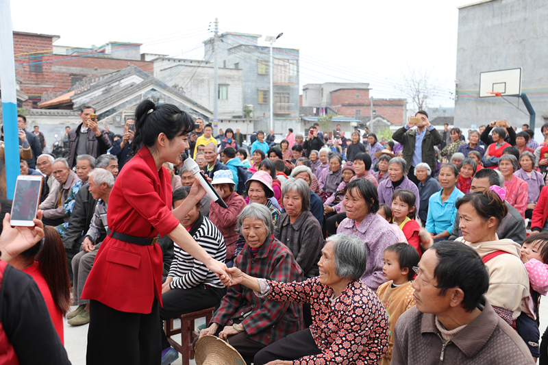南方歌舞团著名歌唱家张琼演唱了《家乡》和《走在小康路上》。原创歌曲《家乡》一唱出来,甜美的嗓音带着浓浓的乡愁直接打动了现场的父老乡亲,唱出了父老乡亲心中爱国爱乡的质朴情感。随后伴随着一曲大气磅礴,令人振奋的《走在小康路上》,张琼走到现场群众中和他们一一握手,把现场气氛推向了高潮,现场欢呼声、鼓掌声此起彼伏。展演过程中恰逢小学生们放学,小学生们三三两两、三五成群围在台前,欣赏着节目,主持人还把小学生们引到台上互动,这种自然、接地气的展演方式让在现场的所有人感觉到党群亲融一家的温暖祥和气氛。