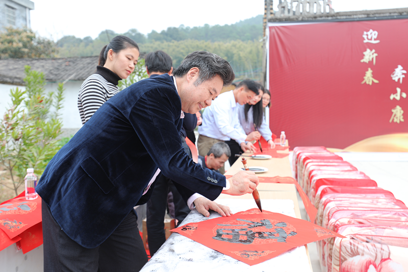 展演结束后,举行了慰问品发放仪式,为侯村90户贫困户发放了90多份红十字会提供的毛毯、花生油等春节慰问品,鼓励贫困户树立信心,增强发展能力,争取早日脱贫。最后,还进行了新春吉祥春联免费派送活动。郑宏彪等书法家现场书写了将近200副春联,连同广东孝文化研究会送来的400多副春联,总共600多副春联给村民送上了新年祝福。