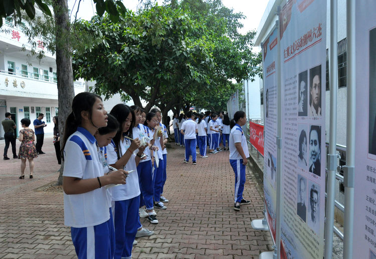 在登塘中学,学生们聚精会神观看展板并认真记录