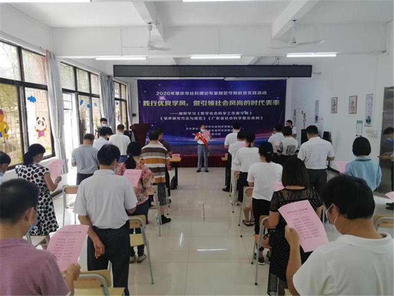 本次活动以“践行优良学风,做引领社会风尚的时代表率”为题,由肇庆市社科联党组成员、专职副主席周春辉分别就《学术研究方法与规范》《社会科学研究方法》《广东省社会科学普及条例》等开展社科工作行业道德和服务规范守则教育,带领全体人员进行《哲学社会科学工作者守则》服务承诺,观看视频影片《肇庆市民文明行为16条》等;活动还邀请了肇庆市委党校党史党建教研室副教授肖向前作《习近平谈治国理政》第三卷专题辅导,组织社科界围绕如何充分发挥职能做好统筹推进常态化疫情防控和经济社会发展服务工作进行学习交流。系列活动深刻阐述了开展社科理论专家“爱国、敬业、文明”行业道德建设的重要意义,引导大家不忘初心、牢记使命,始终把社会责任放在首位,继续保持崇尚精品、严谨治学、注重诚信、讲求责任的优良学风,把握群众需求,聚焦热点难题,提升社科研究水平,营造良好社会风气,为肇庆加快绿色崛起,争当湾区新秀提供智力支持。
