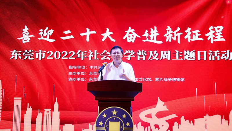 6月22日上午,以“喜迎二十大,奋进新征程”为主题的东莞市2022年社会科学普及周主题日活动在东莞市文化馆实验剧场举行。该活动由东莞市委宣传部指导,东莞市社会科学界联合会主办,东莞报业传媒集团、东莞市文化馆、鸦片战争博物馆协办。