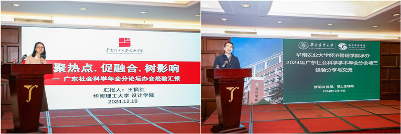 华南理工大学设计学院副院长王枫红教授和华南农业大学管理学院院长罗明忠教授作为年会分会承办单位代表,分别介绍了学校高度重视、认真确定分会主题、广泛征集论文、严密组织会议交流研讨等办会经验做法。