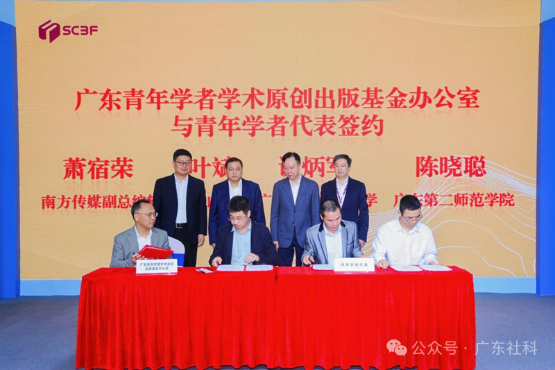 受广东青年学者学术原创出版基金办公室委托,南方传媒副总编辑萧宿荣与中山大学哲学系(珠海)副教授、系副主任叶斌,广东外语外贸大学中国语言文化学院讲师谢炳军,广东第二师范学院文学院讲师陈晓聪等首批获得扶持的3位青年学者代表签约。